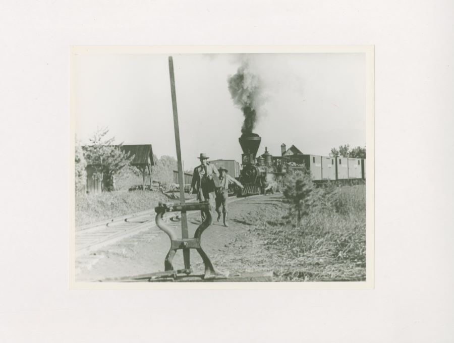 A print of a photograph taken during filming of the 1956 Walt Disney feature “The Great Locomotive Chase.” The reference print was produced in the studio, likely in the 1970s or 1980s, for a marketing or consumer products project. Measuring 8”x10” overall, the photo is in very good condition with minor minor discoloration, including yellowing at the photos edges, and minimal edge wear.